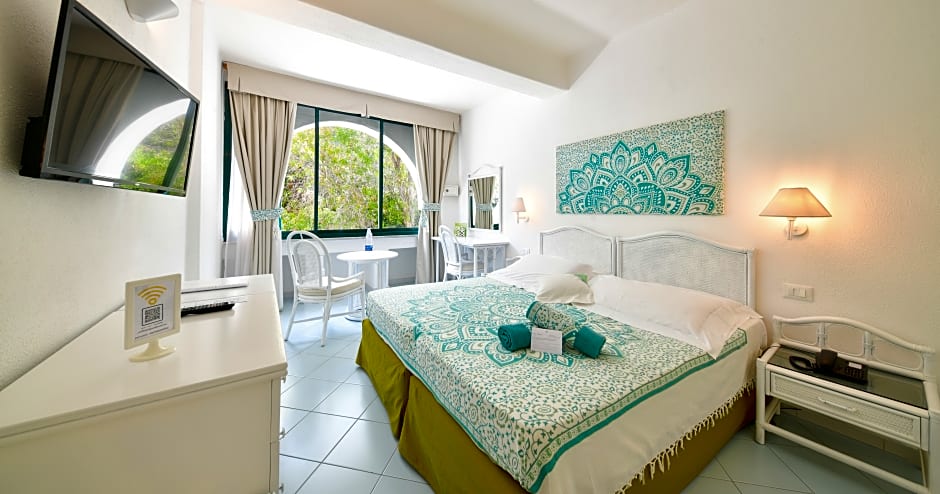 Special with terrace with sea view pool is 291 square feet and includes a king-size bed 150-183 width plus a sofa bed plus terrace, satellite tv , hairdryer, safe, and bathrobes.
